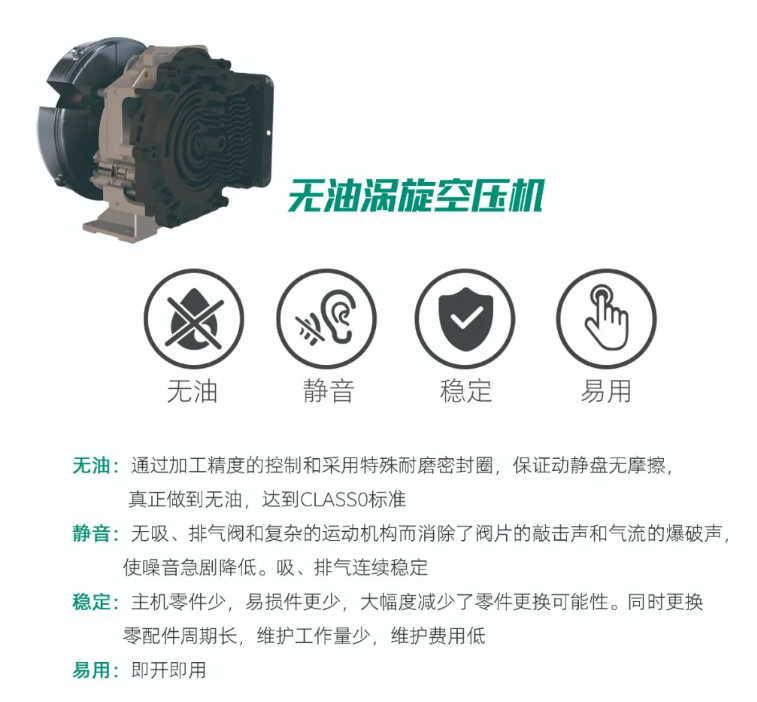 渦旋機(jī)主要是用在醫(yī)院、制藥、食品、飲料、酒廠、實(shí)驗(yàn)室等一些對(duì)噪音和振動(dòng)要求較高的場(chǎng)所,這跟渦旋機(jī)靜音、壓縮空氣無(wú)油特性有直接關(guān)系。