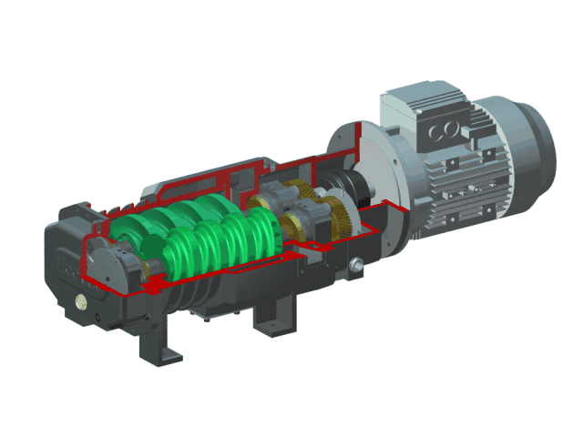 螺桿空壓機(jī)壓縮空氣是靠裝置于機(jī)殼內(nèi)互相平行嚙合的陰陽(yáng)轉(zhuǎn)子的齒槽之容積變化而達(dá)到壓縮空氣的目的。(如下圖)